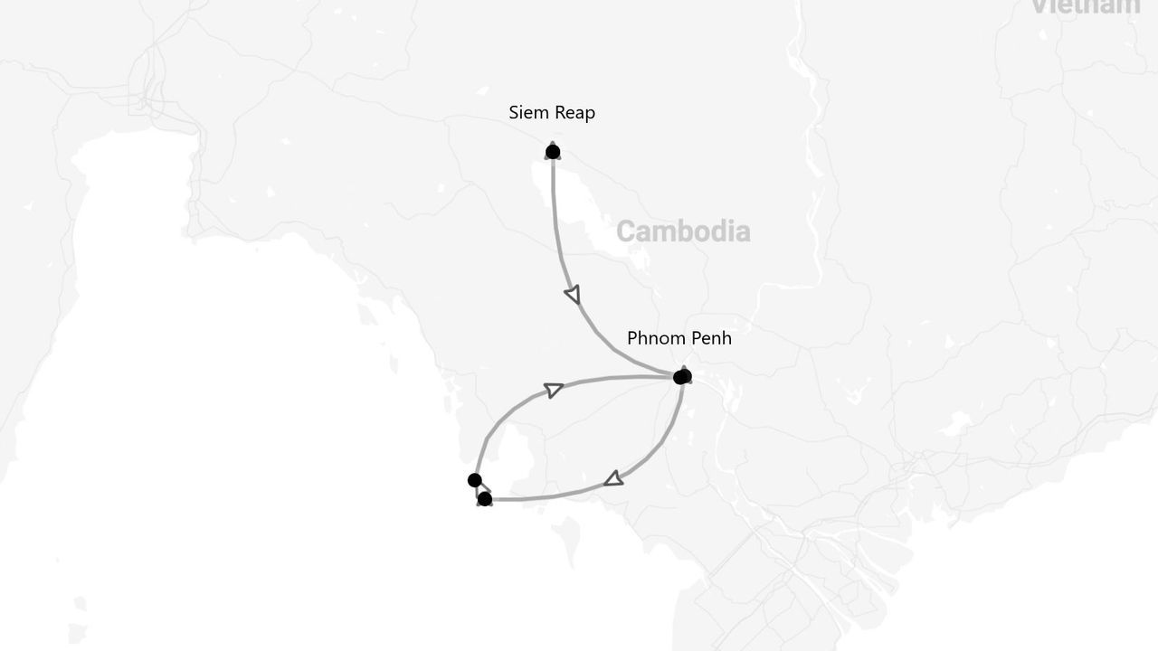 Unser asiatisches Abenteuer beginnt in Siem Reap, dem Tor zu den magischen Tempeln von Angkor Wat. Um diesen wundervollen architektonischen Komplex, ein UNESCO-Weltkulturerbe, zu beschreiben, reichen die Superlative kaum aus. Angkor Wat ist das größte religiöse Bauwerk der Welt, und wir widmen ihm 2 Tage, um die gesamte Anlage zu erkunden – wir sind sicher, es wird uns den Atem rauben! Nachdem wir von den Tempeln und der wilden Natur der Wälder im Norden Kambodschas fasziniert waren, geht es weiter in die Hauptstadt Phnom Penh. Sie ist gleichzeitig chaotisch und faszinierend. Hier lernen wir mehr über die jüngere und ältere Geschichte des Landes, zwischen Tempeln, dem Königspalast, modernen Wolkenkratzern und einem Besuch des ehemaligen Konzentrationslagers. Die Stadt trägt noch immer die Spuren einer sehr schwierigen und blutigen Vergangenheit, die noch zu frisch ist, um bereits historische Erinnerung zu sein. Nachdem wir die Hauptstadt verlassen und mehr über die Kultur und Traditionen des Landes erfahren haben, ist es Zeit für etwas Entspannung! Unser Ziel ist die Insel Koh Rong. Sie hat nichts mit den viel touristischeren und chaotischeren Stränden des benachbarten Thailands gemeinsam – hier fühlen wir uns wie im Paradies! Die letzten Tage verbringen wir am kristallklaren Meer, wählen zwischen Schnorcheln und Tauchen... warum nicht beides? Am letzten Tag kehren wir in die Hauptstadt zurück, um wieder in die Zivilisation einzutauchen, bevor es nach Hause geht, fasziniert von diesem Land mitten im Herzen Südostasiens!